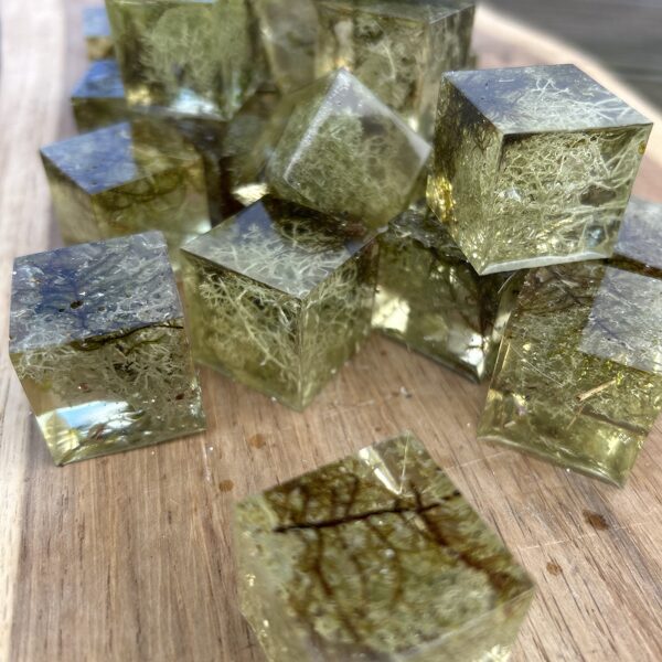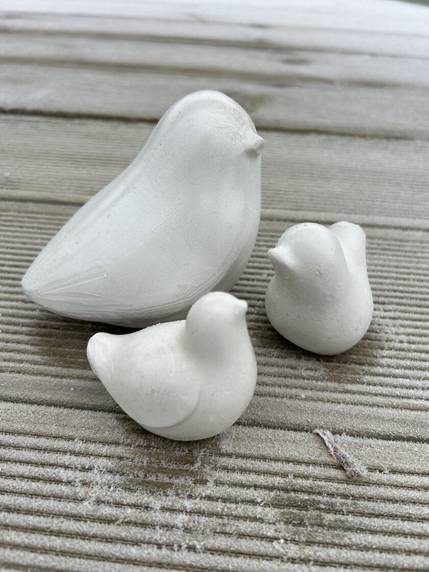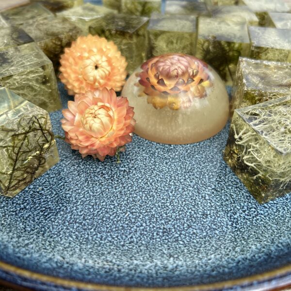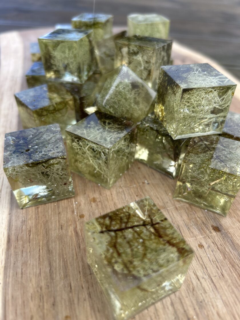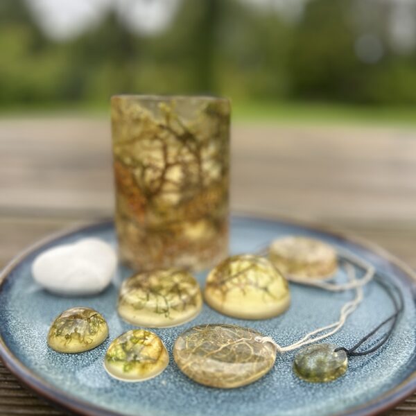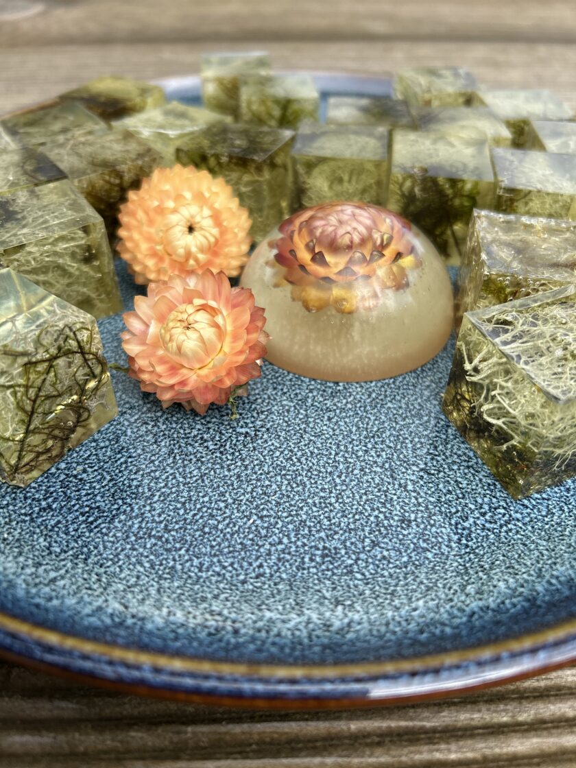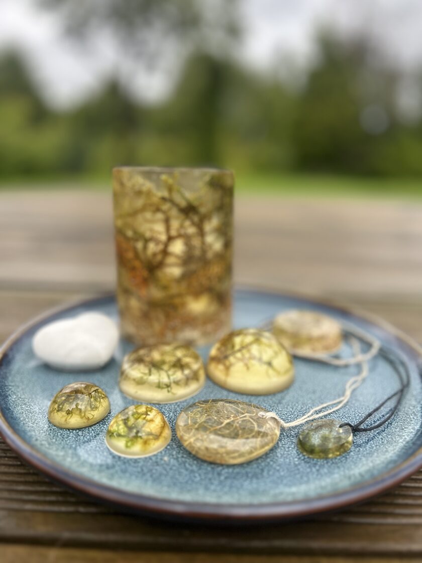 Ģipsis, bišu vasks, epoksīda sveķi kompozīcijās un dekoros.